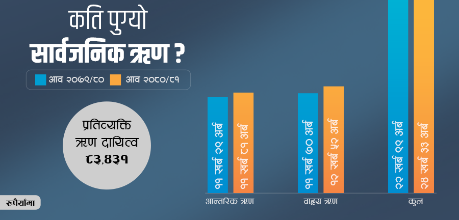 आर्थिक वर्ष २०७९/८० सम्म प्रतिव्यक्ति ऋण दायित्व ७८ हजार ८४० रुपैयाँ रहेको थियो । एक वर्षको अवधिमा प्रतिव्यक्ति ऋण भार नै ४ हजार ५९१ रुपैयाँले बढ्न पुगेको छ । यस्तो ऋण दायित्व नागरिकले प्रत्यक्ष तिर्नु नपरे पनि नागरिकबाट उठाएको करबाटै भुक्तानी गरिने भएका कारण प्रतिव्यक्ति ऋण दायित्वलाई महत्त्वका साथ हेर्ने गरिन्छ । पछिल्लो एक वर्षमा सरकारले कुल ३ खर्ब ५८ अर्ब रुपैयाँ ऋण लिएको छ ।